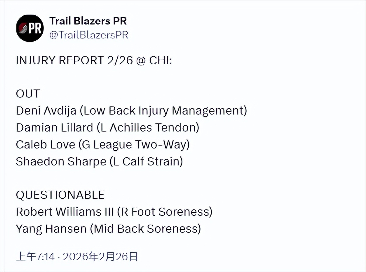Vào ngày 26 tháng 2 theo giờ Bắc Kinh, đội Portland Trail Blazers đã gọi lại Yang Hansen và cập nhật tình trạng chấn thương của anh. Trận đấu ngày mai với Chicago Bulls vẫn còn nghi ngờ (cơ hội ra sân khoảng 50%), chấn thương được ghi nhận là đau nhức vùng giữa lưng. Trước đó, có thông tin anh bị căng cơ lưng. Ngoài ra, Rowe cũng bị nghi ngờ ra sân vì đau chân phải, trong khi Avdija, Lillard, Love và Sharpe được xác định sẽ vắng mặt.