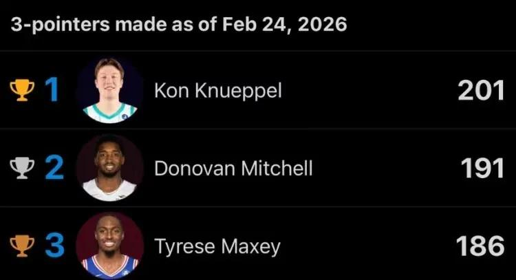 Chàng trai này thực sự rất chuẩn xác, và chỉ cần ném thêm 6 quả ba điểm nữa để đạt 207 quả, anh sẽ trở thành tân binh ghi nhiều ba điểm nhất trong lịch sử NBA, Keegan Murray (Kings), lựa chọn thứ tư vòng một khóa 2022, từng ghi 206 quả ba điểm trong 80 trận mùa 22-23.