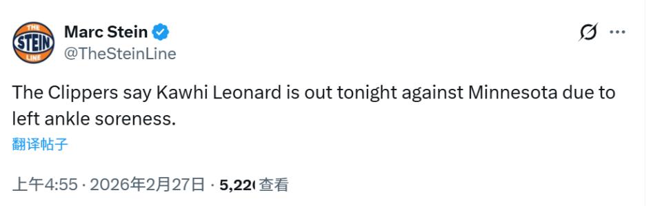 Vào ngày 27 tháng 2 theo giờ Bắc Kinh, Clippers đã cập nhật báo cáo chấn thương, tổng cộng 4 cầu thủ vắng mặt trong trận đấu hôm nay với Timberwolves, bao gồm Leonard (đau mắt cá chân trái), Collins (rách da đầu, đau cổ), Beal (gãy xương hông trái) và Garland (quản lý chấn thương ngón chân trái). Đối với Leonard - người vừa có 37 điểm trong trận trước gặp Magic, đây là trận thứ 14 anh phải nghỉ trong mùa giải này, đồng nghĩa nếu nghỉ thêm 4 trận nữa, anh sẽ không đủ điều kiện tham gia các giải thưởng cuối mùa.