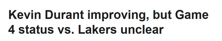 Ngày 26 tháng 4 theo giờ Bắc Kinh, huấn luyện viên đội Rockets Udoka cho biết tình trạng của Durant, lõi đội bị chấn thương, đã tốt hơn, nhưng việc anh có thi đấu ở trận thứ 4 của series với Los Angeles Lakers vào thứ Hai hay không vẫn chưa được quyết định. Rockets hiện đang ở bờ vực bị loại, trên báo cáo chấn thương G4 chính thức, Durant được liệt kê là có thể thi đấu (50% khả năng ra sân).