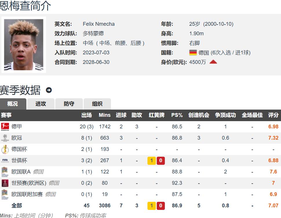 Emre Can hiện 25 tuổi, cao 1,90m, thuận chân phải, chơi vị trí tiền đạo trung tâm, hợp đồng với Dortmund đến năm 2028, định giá theo Transfermarkt là 45 triệu euro. Mùa này anh đã ra sân 40 trận cho Dortmund trên mọi đấu trường, trong đó 33 trận đá chính, đóng góp 6 bàn và 3 kiến tạo.