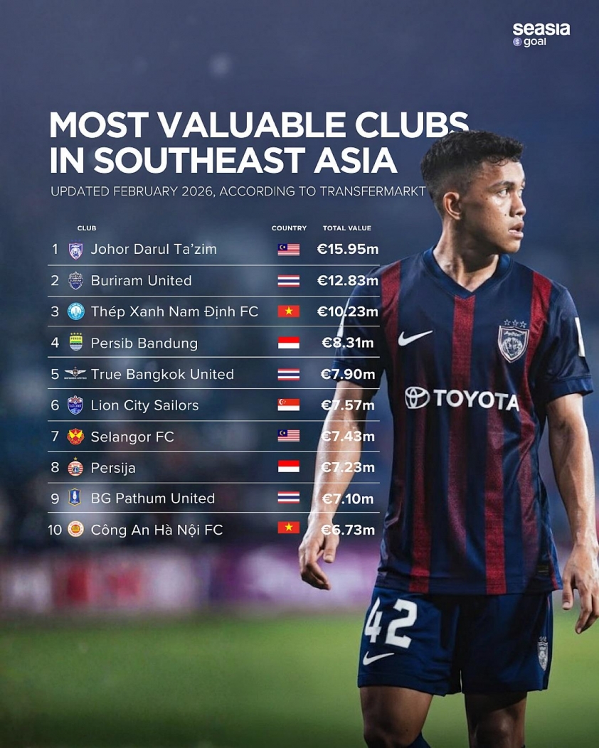 Theo cập nhật mới nhất từ chuyên trang chuyển nhượng Transfermarkt tháng 2/2026, bóng đá Việt Nam có 2 đại diện góp mặt trong BXH Top 10 câu lạc bộ đắt giá nhất Đông Nam Á. Đó là Thép Xanh Nam Định và Công An Hà Nội. Đây cũng là hai đại diện của Việt Nam ở đấu trường quốc tế mùa giải 2025/26.