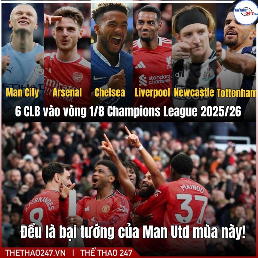Bóng đá Anh đang tạo nên cơn địa chấn tại Champions League 2025/26 khi có tới sáu đại diện góp mặt ở vòng 1/8. Điều đáng chú ý, cả sáu đội bóng này đều là những cái tên sừng sỏ tại Premier League và càng đặc biệt hơn khi họ đều từng trở thành “bại tướng” của Manchester United trong lần chạm trán gần nhất ở giải quốc nội.