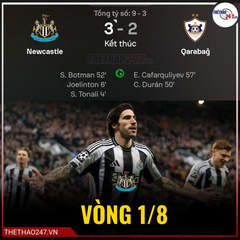 Trong khi đó, Newcastle United phải bước vào vòng play-off nhưng đã thể hiện sức mạnh vượt trội. “Chích chòe” hủy diệt Qarabag với tổng tỷ số 9-3 sau hai lượt trận, qua đó giành tấm vé cuối cùng để giúp Premier League có đủ sáu đại diện tại vòng knock-out.