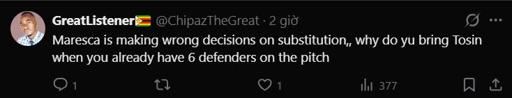 Điều khiến người hâm mộ Chelsea phẫn nộ nhất chính là loạt quyết định thay người bị đánh giá là khó hiểu của chiến lược gia người Ý. Trong hiệp hai, Maresca tung vào sân liên tiếp ba hậu vệ, bao gồm Malo Gusto và Wesley Fofana, trong khi những lựa chọn mang tính tấn công như Santos hay Estevão lại bị bỏ quên trên băng ghế dự bị. Thậm chí khi Fofana bị chấn thương vùng mặt và buộc phải rời sân, Chelsea tiếp tục thay bằng một hậu vệ khác là Tosin Adarabioyo.