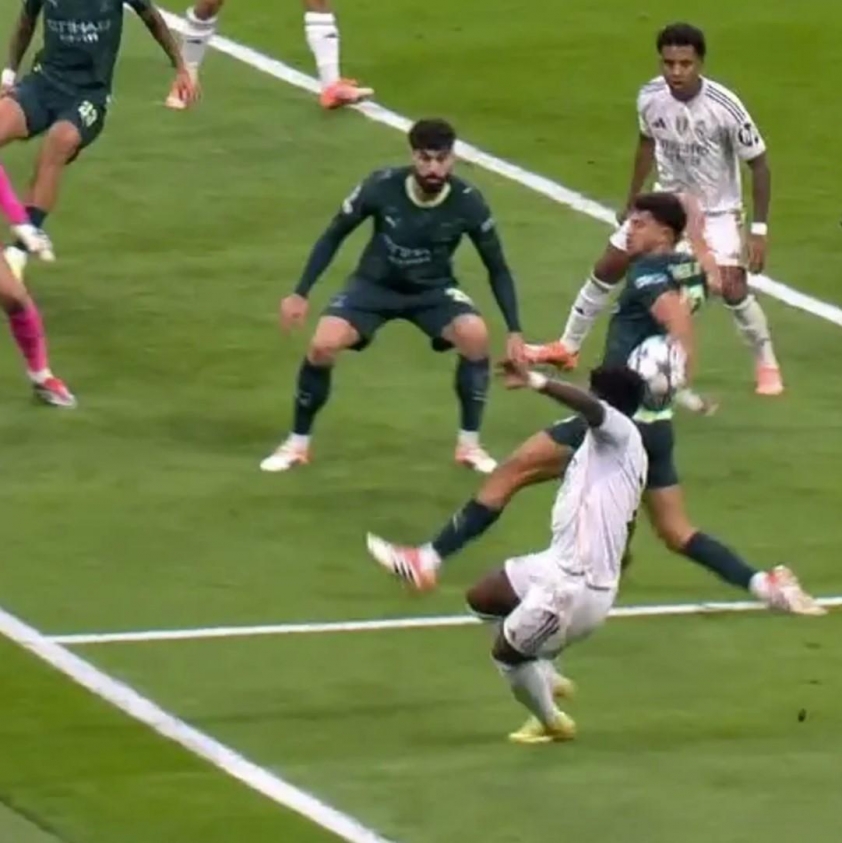 Một tranh cãi khác nổ ra ở phút 16 khi Vinicius tạt bóng và bóng chạm tay Matheus Nunes. Các góc quay chậm cho thấy điểm tiếp xúc rõ ràng, nhưng trọng tài và VAR vẫn không cho Real Madrid hưởng phạt đền. Lý do được đưa ra: tay của Nunes ở vị trí tự nhiên, không cố tình cản bóng và không làm tăng kích thước cơ thể. Quyết định này giúp Pep Guardiola thở phào, trong bối cảnh đội bóng của ông đang chịu áp lực lớn từ những pha lên bóng liên tục của Real.