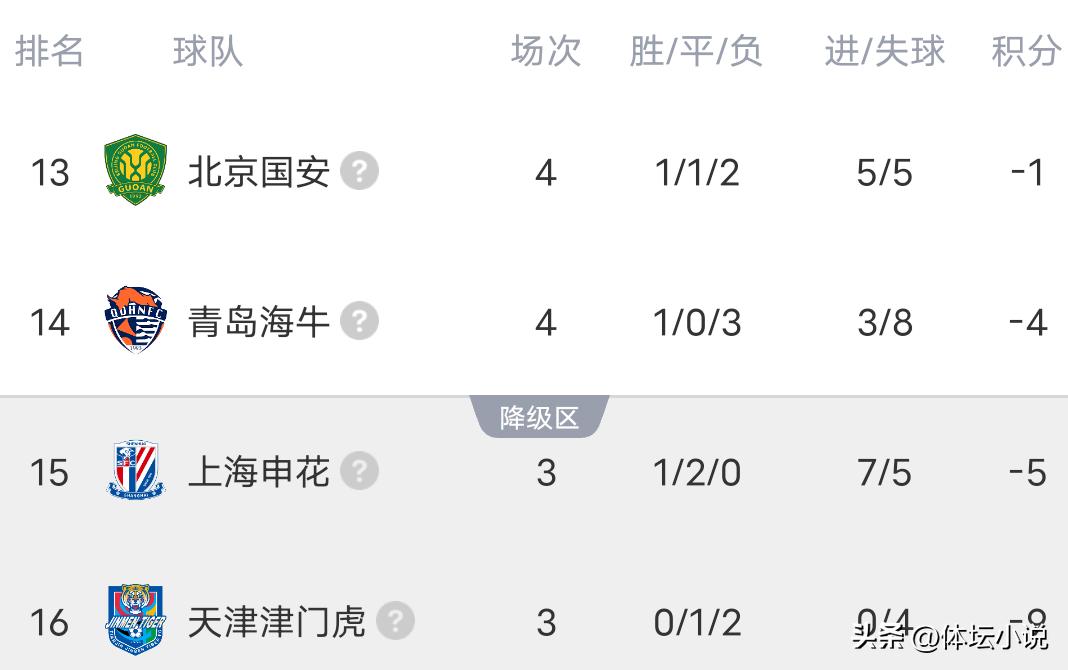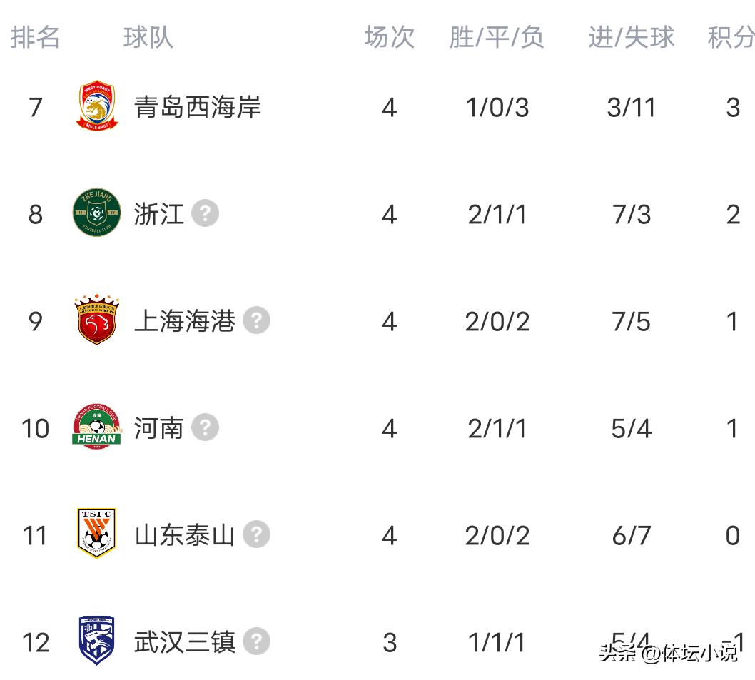 Vào ngày 5 tháng 4 theo giờ Bắc Kinh, các trận đấu vòng 4 của giải VĐQG Trung Quốc đã bắt đầu, hiện đã kết thúc 5 trận. Đội dẫn đầu Chengdu Chengdu thể hiện sức mạnh toàn diện, đánh bại West Coast 5-1, Qingdao海牛 bất ngờ thắng Henan 1-0 để giành chiến thắng đầu tiên, Liaoning bất ngờ lật đổ Beijing国安 2-1, Shandong泰山 bất ngờ thua Dalian 1-2, đương kim vô địch Shanghai Port vượt qua Yunnan 2-1, Zhejiang thua Chongqing 0-1 và nhận thất bại đầu tiên. Do đó, bảng xếp hạng mới nhất đã được công bố: Chengdu không thua sau 4 vòng đứng đầu, Chongqing không thua sau 4 vòng xếp thứ hai, Liaooning thứ tư, Dalian thứ năm!