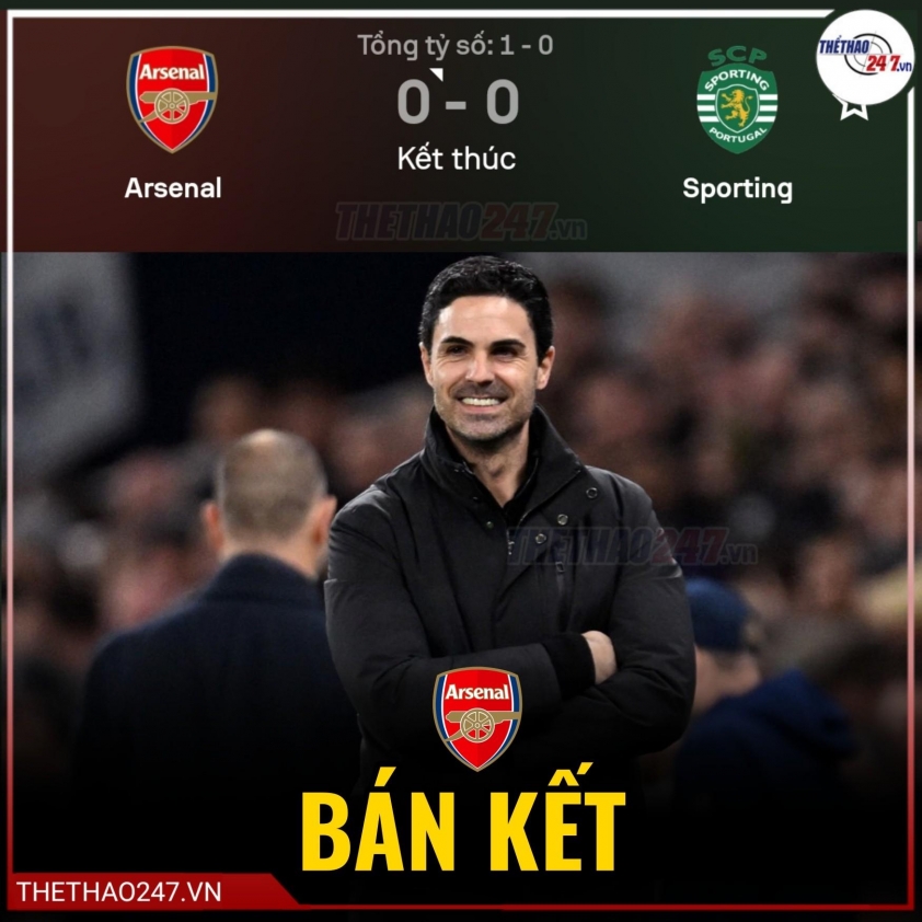 Đội bóng của Arteta vượt qua trận tứ kết lượt về đầy lo âu trước Sporting CP khi cầm hòa 0-0 trên sân Emirates, qua đó giành chiến thắng chung cuộc 1-0 sau hai lượt trận. Arsenal chơi dưới sức ở trận đấu này, nhưng Sporting không thể tận dụng cơ hội. Tình huống đáng chú ý nhất thuộc về Geny Catamo với cú volley trong hiệp một đưa bóng dội cột dọc.