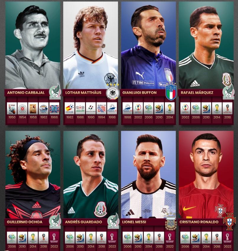 Hiện tại, kỷ lục về số lần tham dự World Cup đang dừng lại ở con số 5. Đây là cột mốc vĩ đại mà chỉ có 8 huyền thoại trong lịch sử bóng đá thế giới chạm đến được: