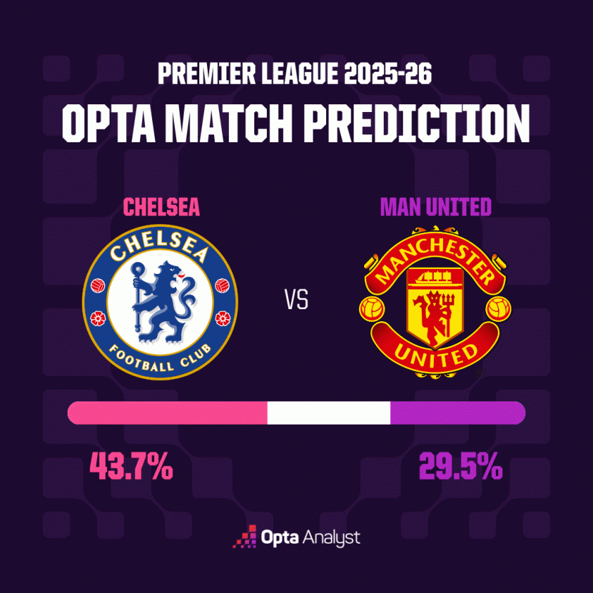 Phải hành quân tới London trong bối cảnh phong độ chưa thực sự ổn định, “Quỷ đỏ” đang bị đánh giá thấp hơn so với đối thủ về khả năng giành chiến thắng. Theo dự đoán từ siêu máy tính Opta, Chelsea là đội chiếm ưu thế với 43,7% cơ hội ca khúc khải hoàn tại Stamford Bridge. Trong khi đó, Man Utd chỉ có 29,5% khả năng giành chiến thắng sau 10.000 lần mô phỏng, còn kịch bản hai đội chia điểm được ước tính ở mức 26,8%.