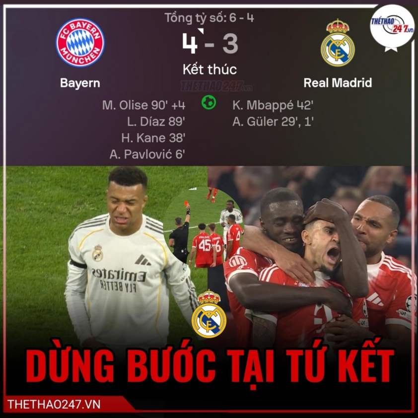 Tận dụng lợi thế hơn người, Bayern liên tiếp tung đòn kết liễu. Luis Diaz gỡ hòa 3-3 ở phút 89 trước khi Michael Olise ghi bàn quyết định ở phút 90+4, khép lại màn ngược dòng nghẹt thở. Bi kịch chưa dừng lại với Real khi Arda Guler bị truất quyền thi đấu cuối trận, còn HLV Alvaro Arbeloa không giấu nổi sự phẫn nộ bên ngoài đường biên.