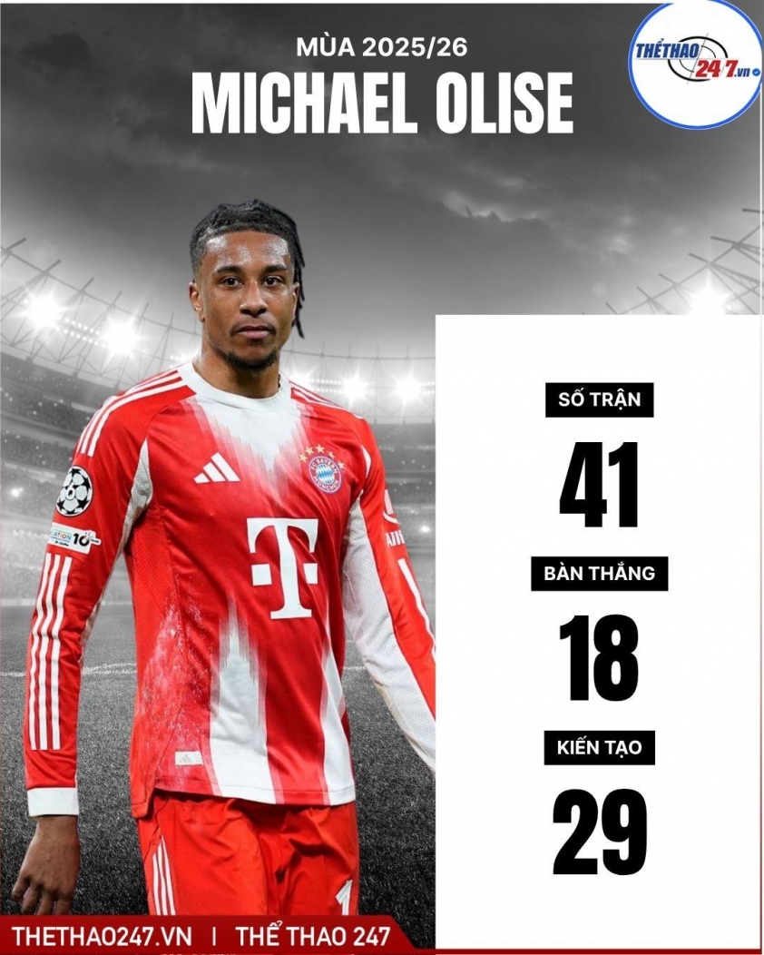 Olise là hiện tượng lớn nhất mùa giải. Gia nhập Bayern từ Crystal Palace, anh nhanh chóng bùng nổ với 18 bàn và 29 kiến tạo sau 41 trận. Những khoảnh khắc tỏa sáng, đặc biệt ở các trận cầu lớn, giúp Olise trở thành một trong những ứng viên nặng ký nhất cho danh hiệu năm nay.