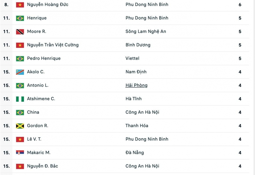 Ở cuộc đua nội binh, Đỗ Hoàng Hên của Hà Nội FC vẫn đang dẫn đầu với 9 bàn thắng, đồng thời xếp thứ ba trong danh sách Vua phá lưới toàn giải. Theo sau là Nguyễn Hoàng Đức với 6 bàn và Nguyễn Trần Việt Cường với 5 bàn. Đình Bắc hiện đứng cùng nhóm với những cái tên như Phạm Gia Hưng và Văn Thuận – các cầu thủ cũng đã có 4 pha lập công mùa này.