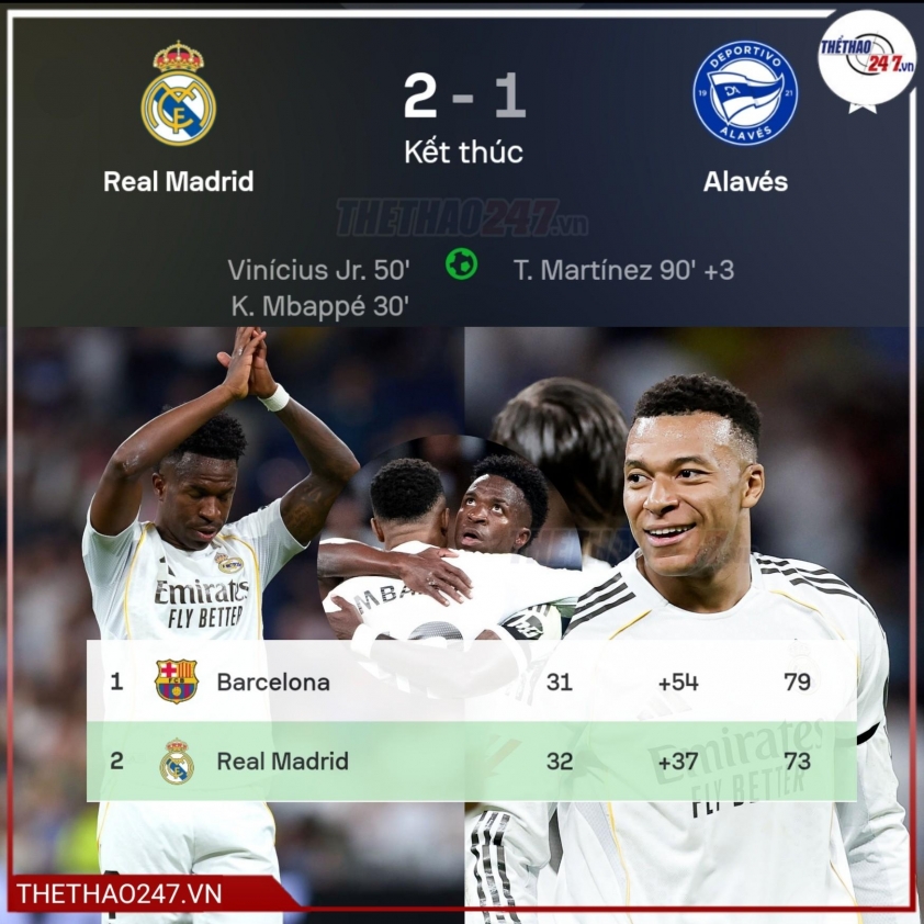(Kết quả bóng đá) - Real Madrid đã thu hẹp khoảng cách với Barcelona xuống còn 6 điểm trên bảng xếp hạng La Liga sau chiến thắng 2-1 trước Deportivo Alaves tại sân Bernabeu. Trong khi đó, thất bại này khiến Alaves đối mặt nguy cơ rơi xuống nhóm cầm đèn đỏ sau vòng đấu.