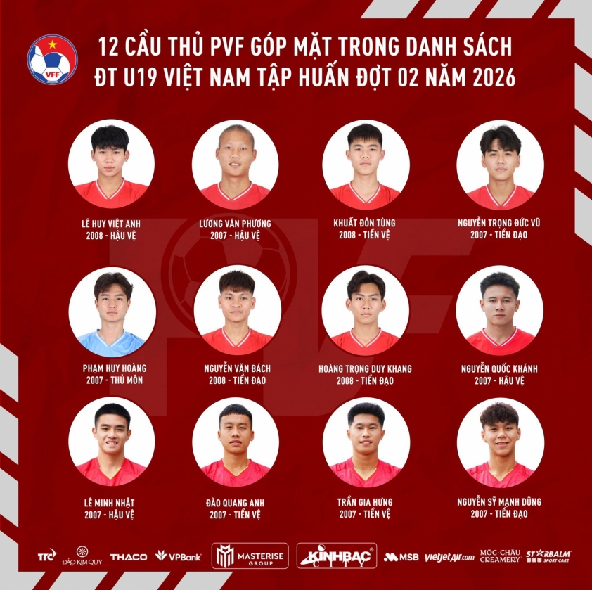 Đợt tập huấn tháng 4 và 5/2026 của U19 Việt Nam tiếp tục ghi nhận dấu ấn đậm nét từ PVF khi có tới 12 cầu thủ được gọi lên tuyển, cùng với sự góp mặt của một huấn luyện viên trong ban huấn luyện.