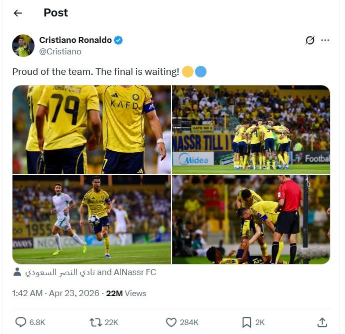 Sau trận đấu, Ronaldo đã đăng tải thông điệp đầy cảm xúc trên mạng xã hội: “Tự hào về toàn đội. Trận chung kết đang chờ phía trước!”. Đó không chỉ là lời động viên, mà còn thể hiện khát khao chinh phục danh hiệu lớn đầu tiên của siêu sao người Bồ Đào Nha kể từ khi anh chuyển tới Trung Đông thi đấu.