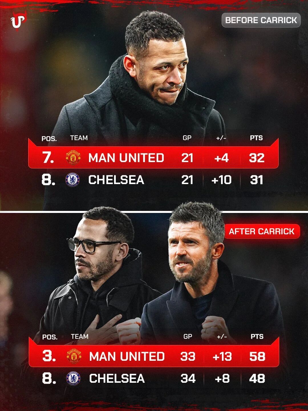 Số liệu cho thấy, trước khi Solskjaer được chuyển đổi chính thức, Manchester United thắng 14 trong 19 trận; nhưng sau khi ông được công bố là huấn luyện viên chính thức, Manchester United chỉ thắng 2 trong 10 trận cuối cùng và thua 6, cuối cùng không đủ điều kiện dự Champions League. Hiện tại, Carrick đã thắng 8 trong 12 trận đầu dẫn dắt, đội bóng có cơ hội trở lại Champions League, nhưng câu lạc bộ dự kiến sẽ đợi đến sau khi kết thúc mùa giải để quyết định việc ông tiếp tục hay không.