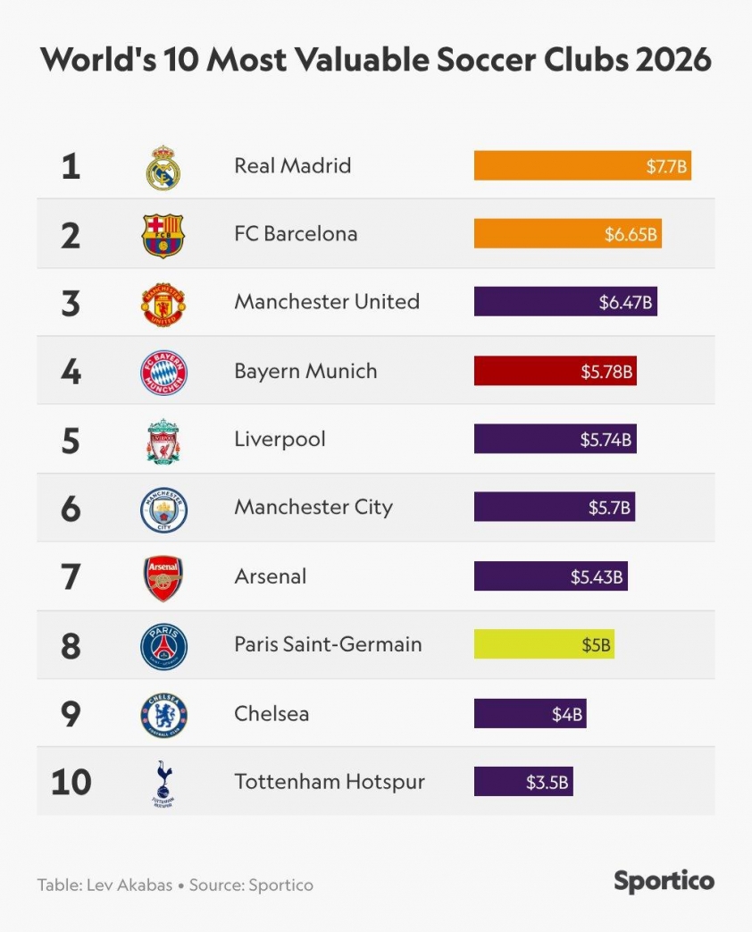Thông tin này đến từ Sportico, đơn vị vừa công bố bảng xếp hạng thường niên 50 CLB bóng đá giá trị nhất thế giới. Một lần nữa, Real Madrid đứng đầu danh sách với mức định giá 5,7 tỷ bảng, trong khi Barcelona xếp ngay sau với giá trị 4,92 tỷ bảng. Manchester United đứng thứ ba với mức định giá 4,79 tỷ bảng, giảm một bậc so với vị trí thứ hai mà họ nắm giữ vào năm 2025. Trong năm qua, giá trị của CLB đã tăng thêm 0,28 tỷ bảng.