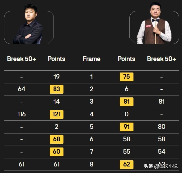 Sau khi trận đấu bắt đầu, ván đầu tiên cả hai thi đấu với nhịp độ chậm, Ding Junhui trong cuộc cạnh tranh gay gắt liên tục ghi điểm để thắng ván, dẫn trước 1-0. Ván hai Zhao Xintong thắng bằng cú đánh đơn để cân bằng tỷ số. Ván ba Ding Junhui thắng bằng cú đánh đơn để lại dẫn trước. Ván bốn Zhao Xintong thẳng thắn phá trăm điểm để thắng, cân bằng tỷ số 2-2. Ván năm Ding Junhui thắng bằng cú đánh đơn để lại dẫn trước. Sau đó, Ding Junhui tuy liên tục đánh ra hai cú trên 50 điểm, nhưng lại bị Zhao Xintong liên tục hai ván hoàn thành lội ngược dòng lớn. Zhao Xintong dẫn trước 4-3 và nới rộng khoảng cách. Ván tám Ding Junhui đáp trả, đối mặt với Zhao Xintong đã đánh cú đơn 61 điểm, thẳng thắn trình diễn cú đơn 62 điểm để kết thúc ván đầy nghẹt thở. Như vậy cả hai trong giai đoạn đầu đã chia điểm 4-4, tổng thể thi đấu cực kỳ xuất sắc, được coi là trận đấu Snooker Trung Quốc mạnh nhất!