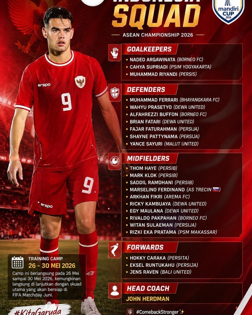 Dù vậy, Indonesia vẫn sở hữu nhiều nhân tố đáng chú ý như Shayne Pattynama, Marc Klok, Thom Haye, Jens Raven cùng các nội binh quen thuộc như Witan Sulaeman, Saddil Ramdani, Egy Maulana Vikri hay Hokky Caraka. ĐT Indonesia sẽ hội quân tại Jakarta từ ngày 26 đến 30-5 trước khi bước vào ASEAN Cup 2026, nơi họ nằm chung bảng với Việt Nam, Singapore, Campuchia và đội thắng ở cặp play-off giữa Brunei với Timor Leste.