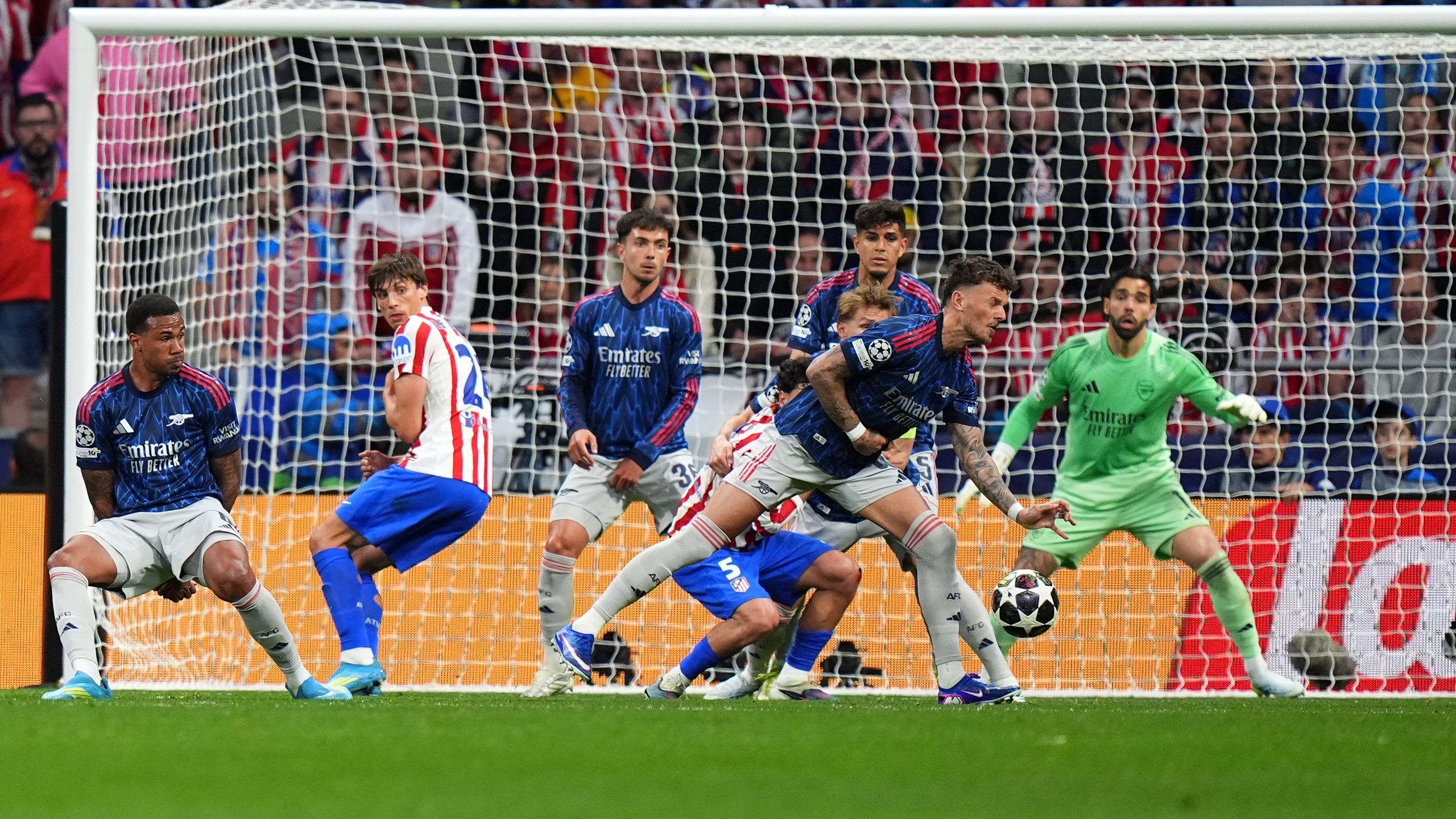 Tình huống đầu tiên diễn ra đầu hiệp hai khi Ben White bị xác định để bóng chạm tay trong vòng cấm sau pha bóng lộn xộn. Dù bóng đã chạm người trước khi nảy lên tay, trọng tài vẫn cho Atletico hưởng phạt đền sau khi tham khảo VAR. Julian Alvarez tận dụng cơ hội để gỡ hòa 1-1.