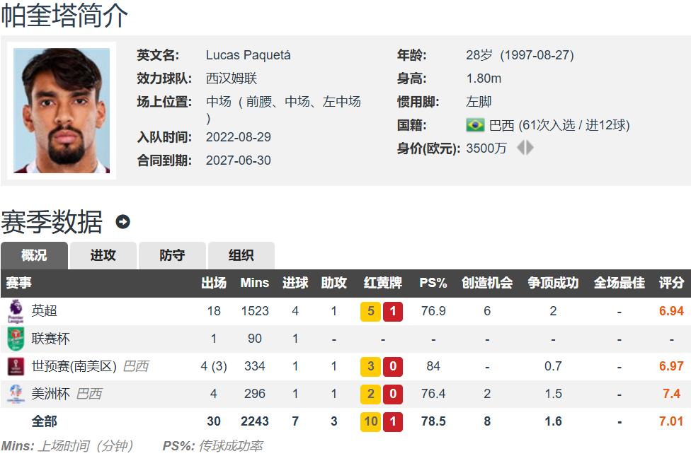 Paqueta hiện 28 tuổi, cao 1,80 mét, là tiền vệ tấn công thuận chân trái, hợp đồng với West Ham kéo dài đến năm 2027. Mùa này, anh đã ra sân 18 trận Ngoại hạng Anh, tất cả đều đá chính, đóng góp 4 bàn thắng và 1 kiến tạo.