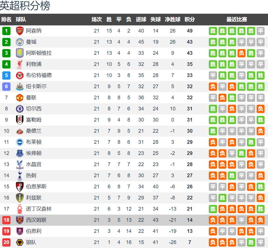 Sau 21 vòng đấu Ngoại hạng Anh, West Ham thắng 3, hòa 5, thua 13, có 14 điểm, đứng thứ ba từ dưới lên, đang nằm trong khu vực xuống hạng, kém đội đứng thứ 17 Nottingham Forest đến 7 điểm, tình hình trụ hạng đang rất nguy cấp.