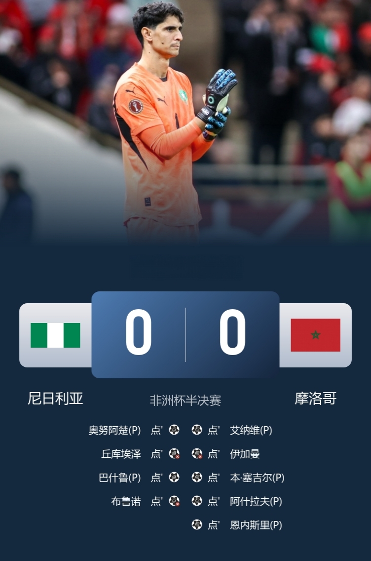 Trận bán kết còn lại giữa Nigeria và Morocco kết thúc 0-0, hai đội phải bước vào loạt sút luân lưu, thủ môn Bounou cản phá thành công hai quả penalty, Ashraf và En-Nesyri đều thực hiện thành công, giúp Morocco loại Nigeria để tiến vào chung kết.