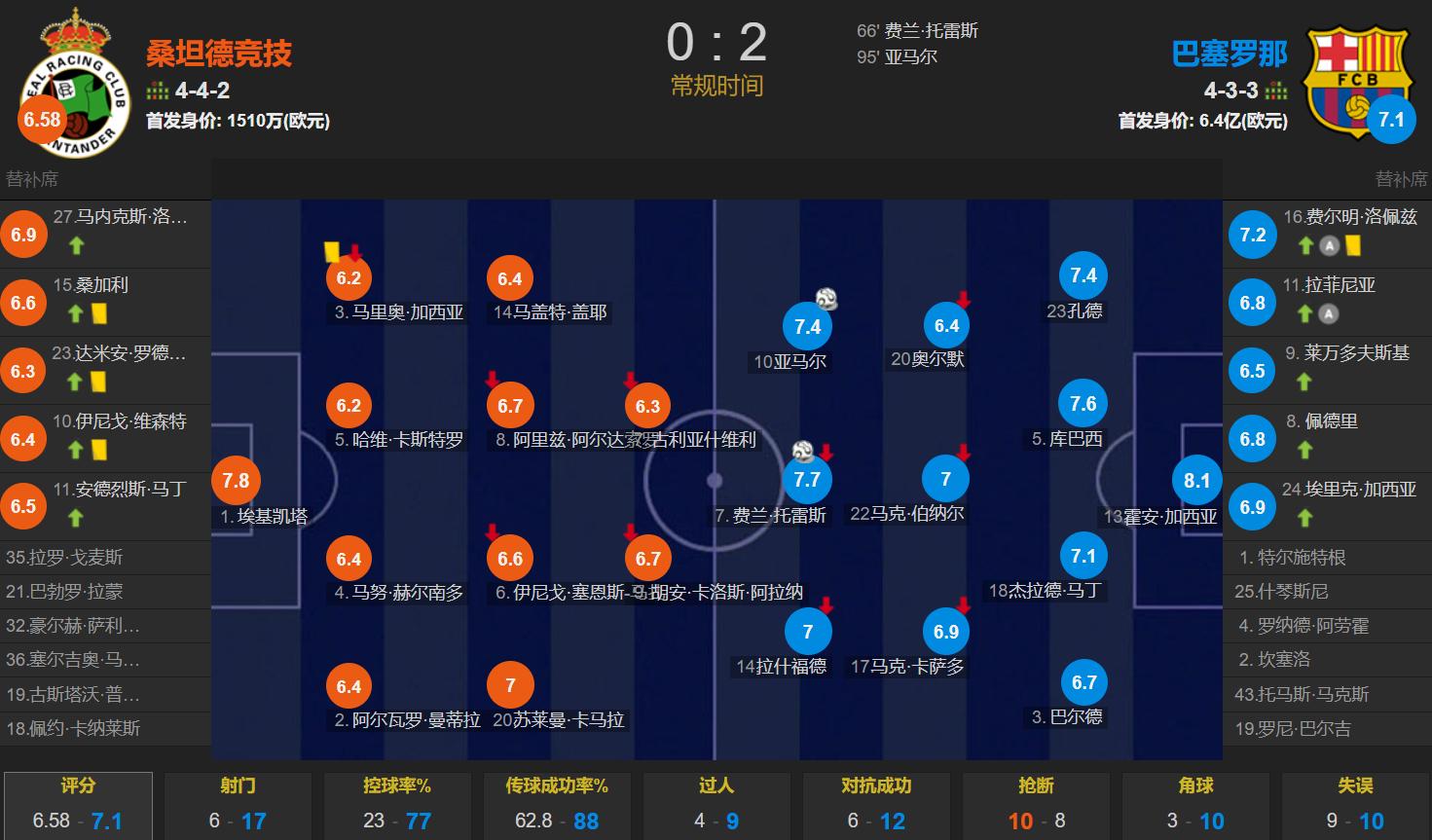 Toàn trận,Barca kiểm soát bóng 77%, có tổng cộng 17 cú sút, trong đó 7 lần trúng đích; Santander Athletic có 6 cú sút, trong đó 3 lần trúng đích.