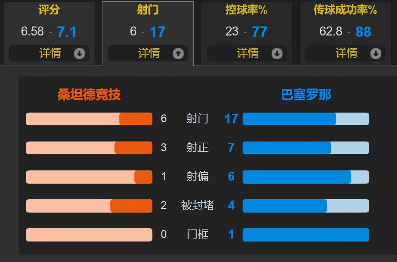 Dù khoảng cách giá trị đội hình giữa hai đội rất lớn, nhưng Barca không dễ dàng giành chiến thắng. Hiệp một, Barca có ít cú sút trúng đích hơn đối thủ, kiểm soát bóng 82%, với 5 cú sút và 1 lần trúng đích, trong khi Santander Athletic có 2 cú sút trúng đích. Hai đội hòa 0-0 sau hiệp một. Sang hiệp hai, Barca thay Bernal bằng Fermin để tăng cường tấn công, dù kiểm soát bóng giảm xuống 73%, nhưng có 12 cú sút với 6 lần trúng đích, còn Santander Athletic có 4 cú sút và 1 lần trúng đích. Bộ đôi tiền đạo Tây Ban Nha Ferran và Yamal giúp Barca dẫn 2-0 và giành chiến thắng cuối cùng, nhưng trận thắng này vẫn rất kịch tính. Joan Garcia hiện là thủ môn mạnh nhất La Liga, cản phá xuất sắc các pha đối mặt, dù hàng thủ Barca có sai sót, nhưng sự xuất sắc của Joan Garcia giúp giữ sạch lưới trước đội đầu bảng giải hạng Hai, suôn sẻ tiến vào tứ kết Cúp Nhà Vua!