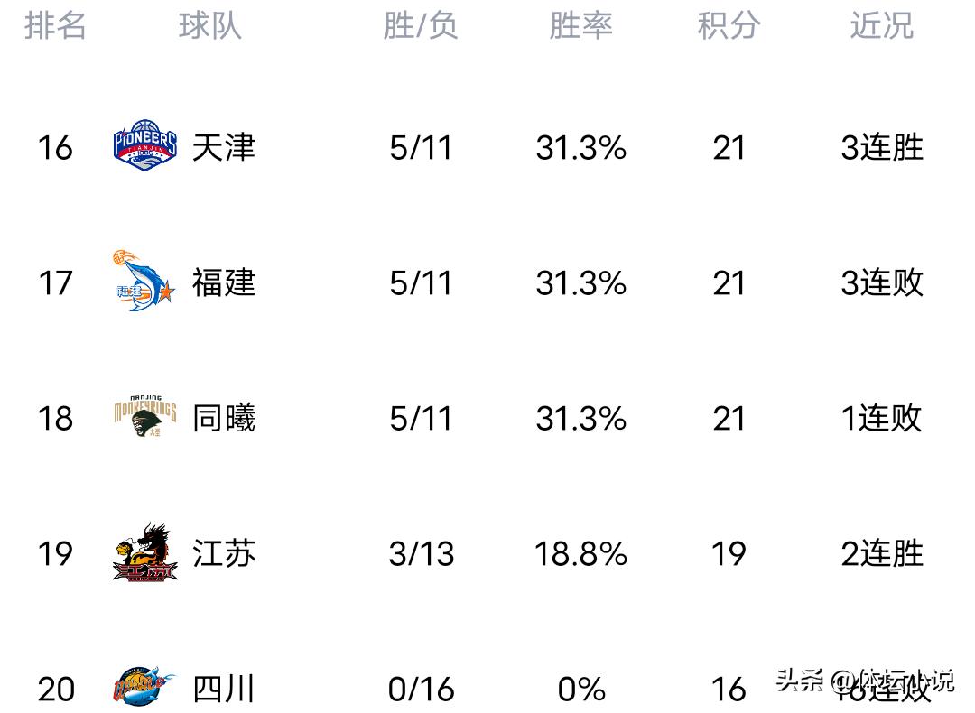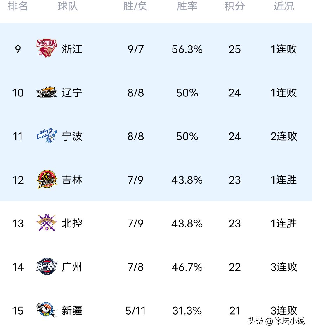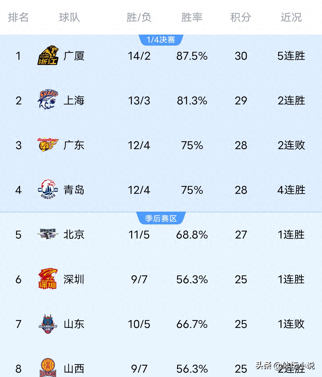 Theo giờ Bắc Kinh ngày 19 tháng 1, giải đấu CBA tiếp tục diễn ra, đêm qua kết thúc năm trận đấu, trong đó Liaoning thua sát nút Shenzhen 83-87, Thượng Hải thắng Tân Cương 80-70, Sơn Tây thắng Phúc Kiến 104-83, Bắc Kinh vượt qua Ninh Ba 94-86, Thiên Tân thắng Đồng Tức 102-94, như vậy bảng xếp hạng mới nhất đã được cập nhật, cụ thể xem hình dưới đây!