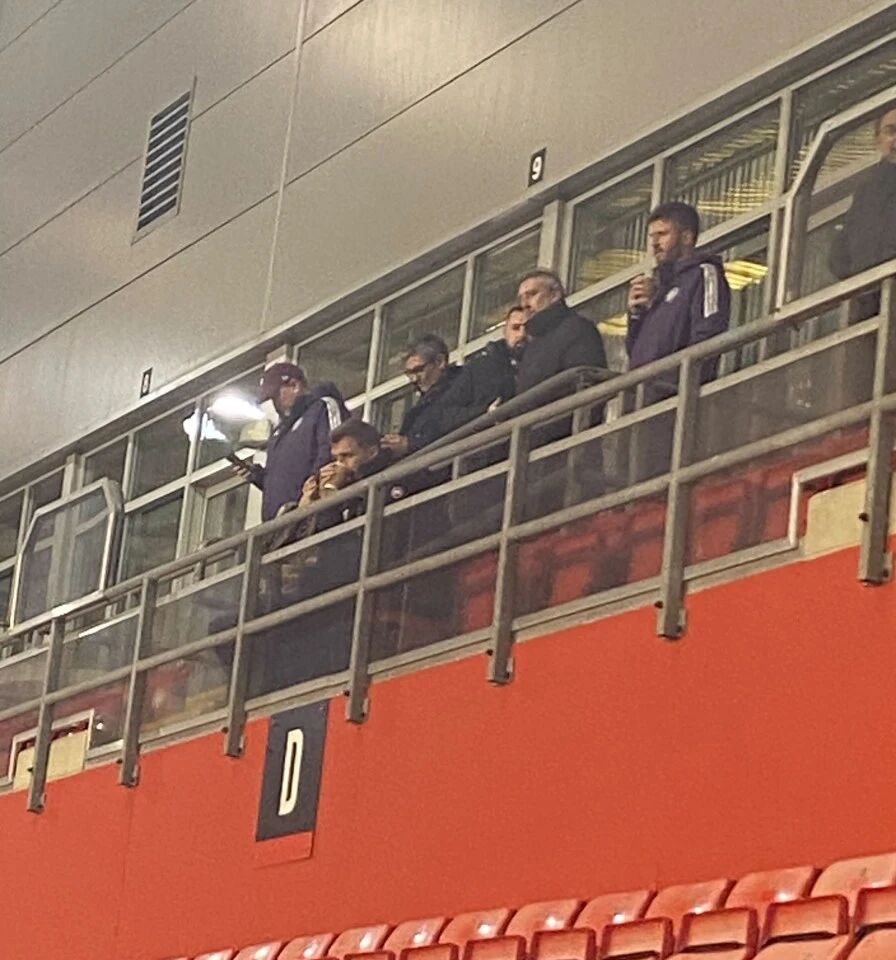 Carrick cầm cốc cà phê, cùng Giám đốc Thể thao Man United Jason Wilcox, huấn luyện viên đội U18 Darren Fletcher và các thành viên ban huấn luyện đội một Steve Holland, Jonathan Woodgate và Jonny Evans xuất hiện trên khán đài.