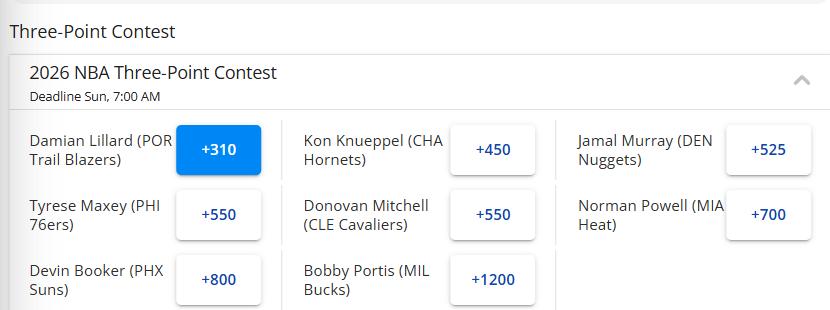 Vào ngày 11 tháng 2 theo giờ Bắc Kinh, cuối tuần All-Star sắp đến gần, tỷ lệ cược vô địch cuộc thi ném 3 điểm đã được công bố. Điều bất ngờ là người được đánh giá cao nhất lại là Lillard, người đã nghỉ thi đấu cả mùa giải. Anh đứng đầu với tỷ lệ +310, vượt qua tay ném đang thăng hoa của Hornets, Knapper (+450). Người xếp cuối là tiền phong của Bucks, Portis (+1200). Dưới đây là bảng xếp hạng chi tiết —