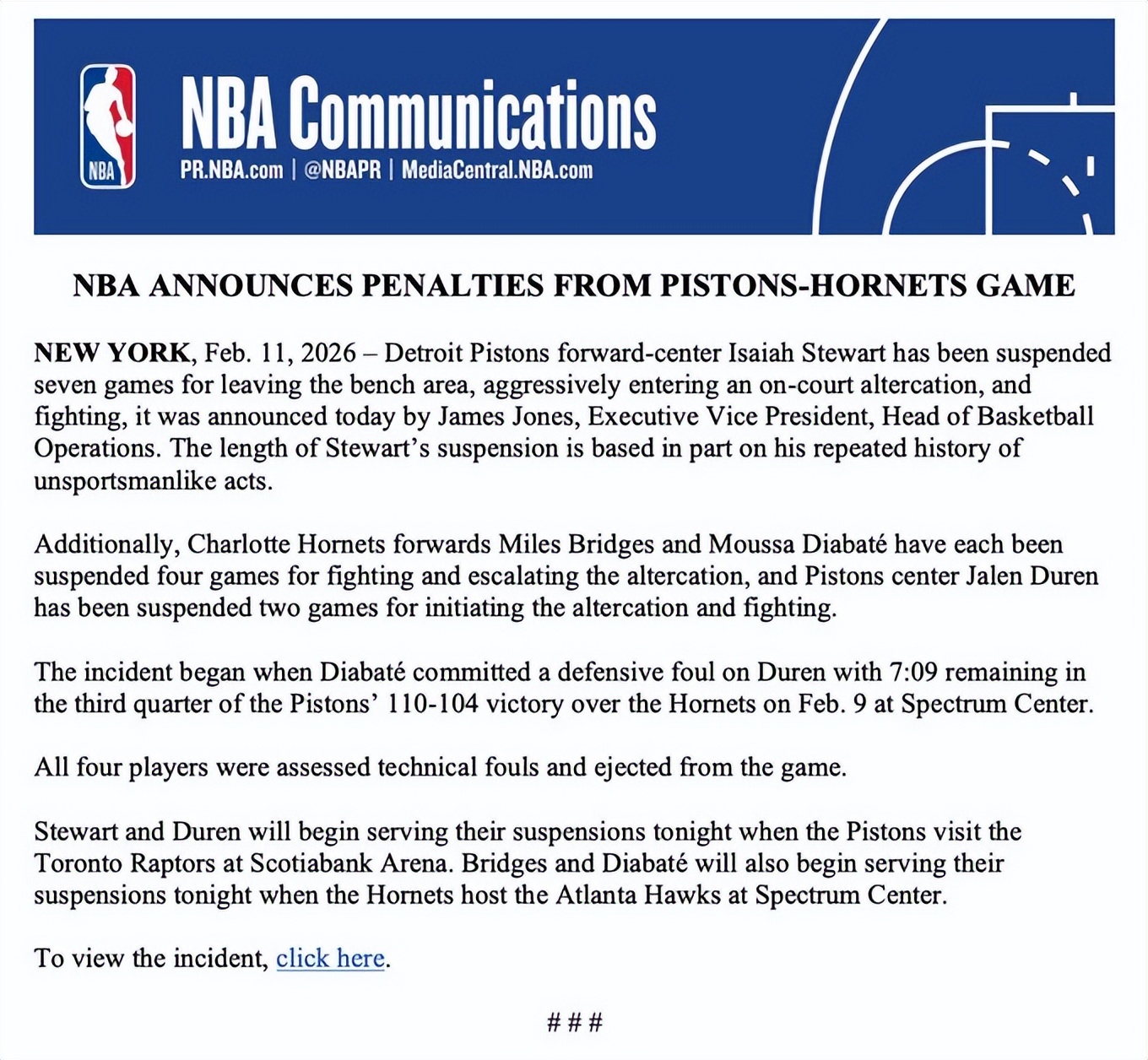 Trước đó, NBA cũng công bố một án phạt lớn khác liên quan đến cuộc ẩu đả khiến bốn người bị truất quyền thi đấu trong trận Hornets vs Pistons —