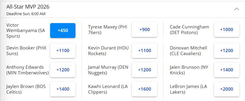 Maxey và Cunningham cũng được đánh giá khá cao, cầu thủ trẻ thường có nhiều nhiệt huyết hơn và sẵn sàng thể hiện mình ở trận All-Star. Ngược lại, các cầu thủ kỳ cựu không được đánh giá cao bằng, Durant là người giàu kinh nghiệm có tỷ lệ cược cao nhất trong số họ.