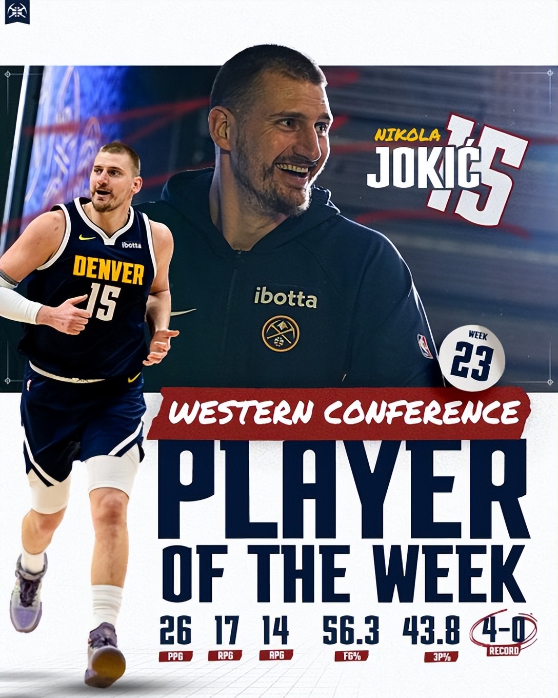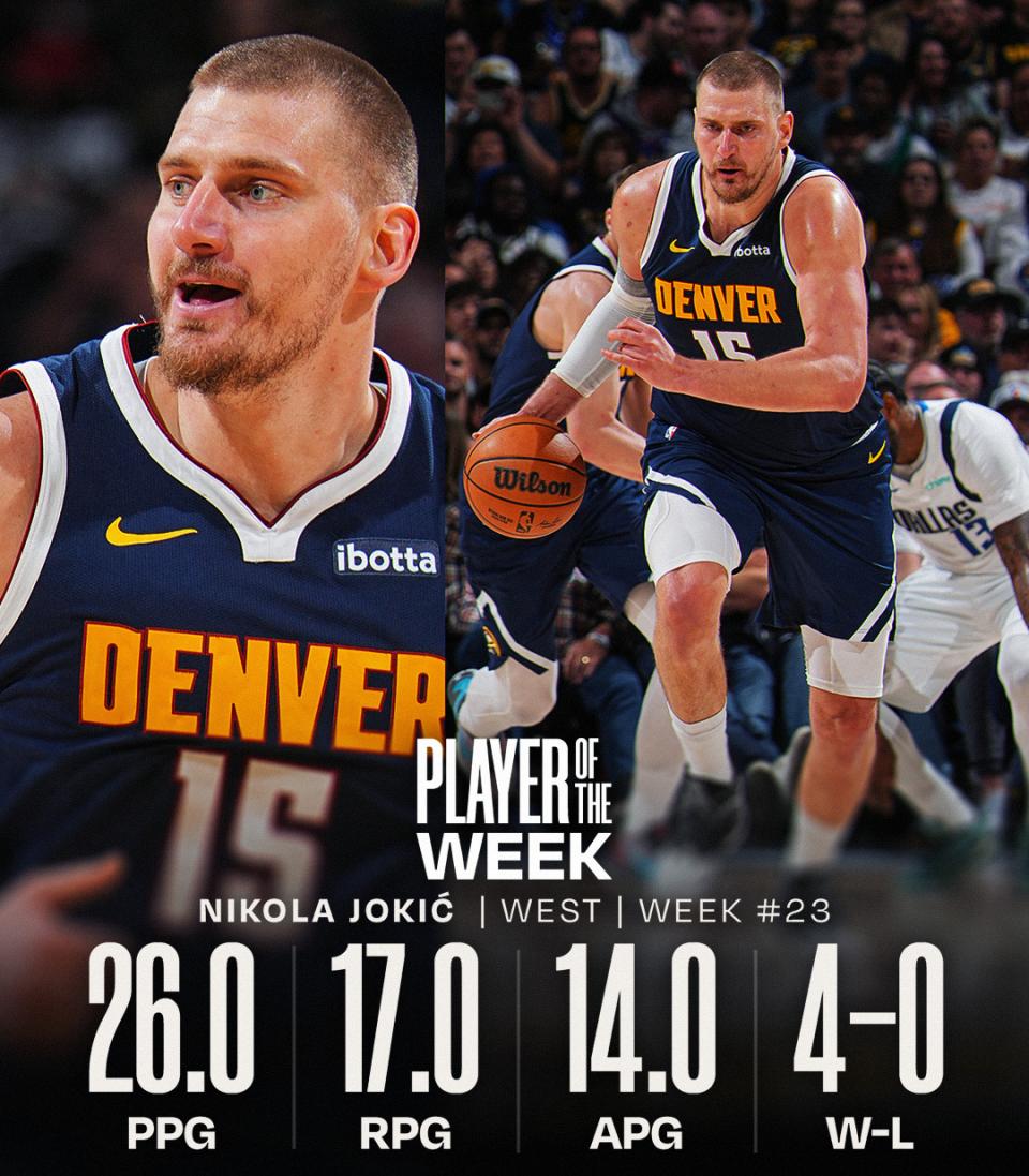 Trong trận đấu với Suns, Jokic có 23 điểm 17 rebound 17 assist, trở thành cầu thủ thứ 12 trong lịch sử NBA đạt thành tích 17+ điểm, 17+ rebound, 17+ assist trong một trận, và đây là lần thứ ba trong sự nghiệp anh đạt được thành tích này. Trận đấu với Mavericks, anh có 23 điểm 21 rebound 19 assist 1 steal, trở thành cầu thủ đầu tiên trong lịch sử NBA đạt thành tích 20+ điểm, 17+ rebound, 17+ assist trong hai trận liên tiếp. Trận đấu với Jazz, anh đóng góp 33 điểm 16 rebound 12 assist 1 steal, đạt triple-double lần thứ ba trong tuần. Trận đấu với Warriors, anh có 25 điểm 15 rebound 8 assist 1 steal, cao nhất trận.