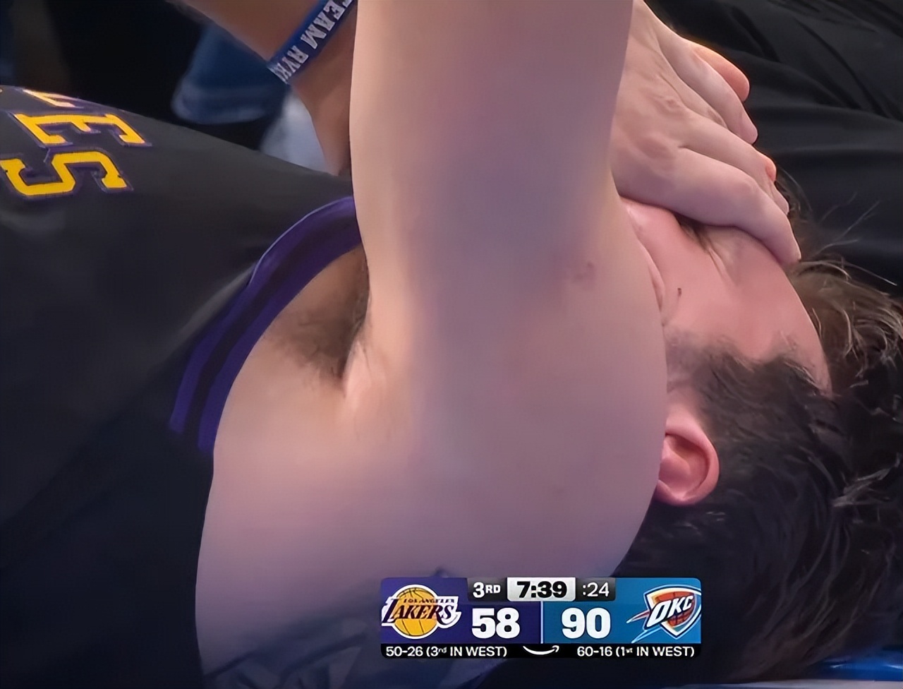 Hiệp ba, Lakers tiếp tục chịu tổn thất nghiêm trọng, khi Luka Doncic - nhân tố cốt lõi - trong lúc xâm nhập vòng cấm đã bị thương đột ngột dù tình huống tranh chấp không quá mãnh liệt, ngã xuống trong đau đớn và không thể đứng lên trong một khoảng thời gian dài.