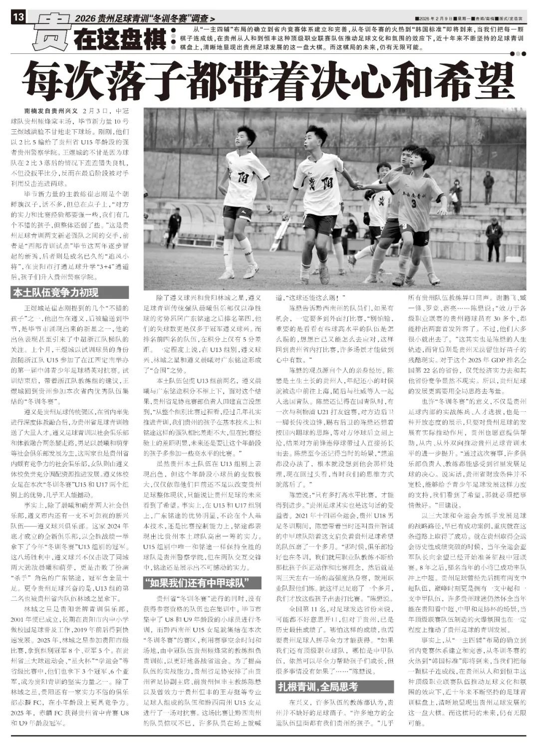 Thực tế, từ khi xác lập mô hình "một chính bốn phụ", đến xây dựng và hoàn thiện hệ thống thi đấu trong tỉnh, từ sự sôi động của huấn luyện mùa đông và thi đấu mùa đông đến chuẩn mực "tiêu chuẩn Hàn Quốc" sắp tới, khi chúng ta nối các bước đi lại với nhau, dưới ảnh hưởng của đội bóng chuyên nghiệp hàng đầu như Nhân Hòa và Hằng Phong thúc đẩy văn hóa và không khí bóng đá ở Quý Châu, trong gần một thập kỷ kiên trì phát triển đào tạo trẻ, bức tranh lớn về sự phát triển bóng đá Quý Châu hiện rõ ràng. Và tương lai của ván cờ này vẫn còn vô hạn khả năng.