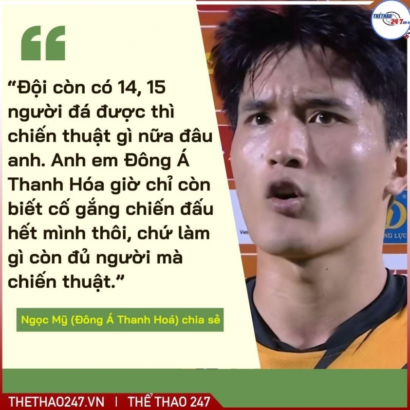 Sau trận, tiền vệ Nguyễn Ngọc Mỹ thẳng thắn chia sẻ về hoàn cảnh ngặt nghèo của đội. “Đội còn có 14-15 người đá được thì chiến thuật gì nữa đâu anh. Anh em Đông Á Thanh Hóa giờ chỉ biết cố gắng chiến đấu hết mình chứ làm gì còn đủ người mà chiến thuật”, ngôi sao vừa trở về từ U23 Việt Nam nói. Câu nói mộc mạc ấy phản ánh đúng thực tế, khi mọi toan tính chiến thuật gần như bị xếp lại phía sau.
