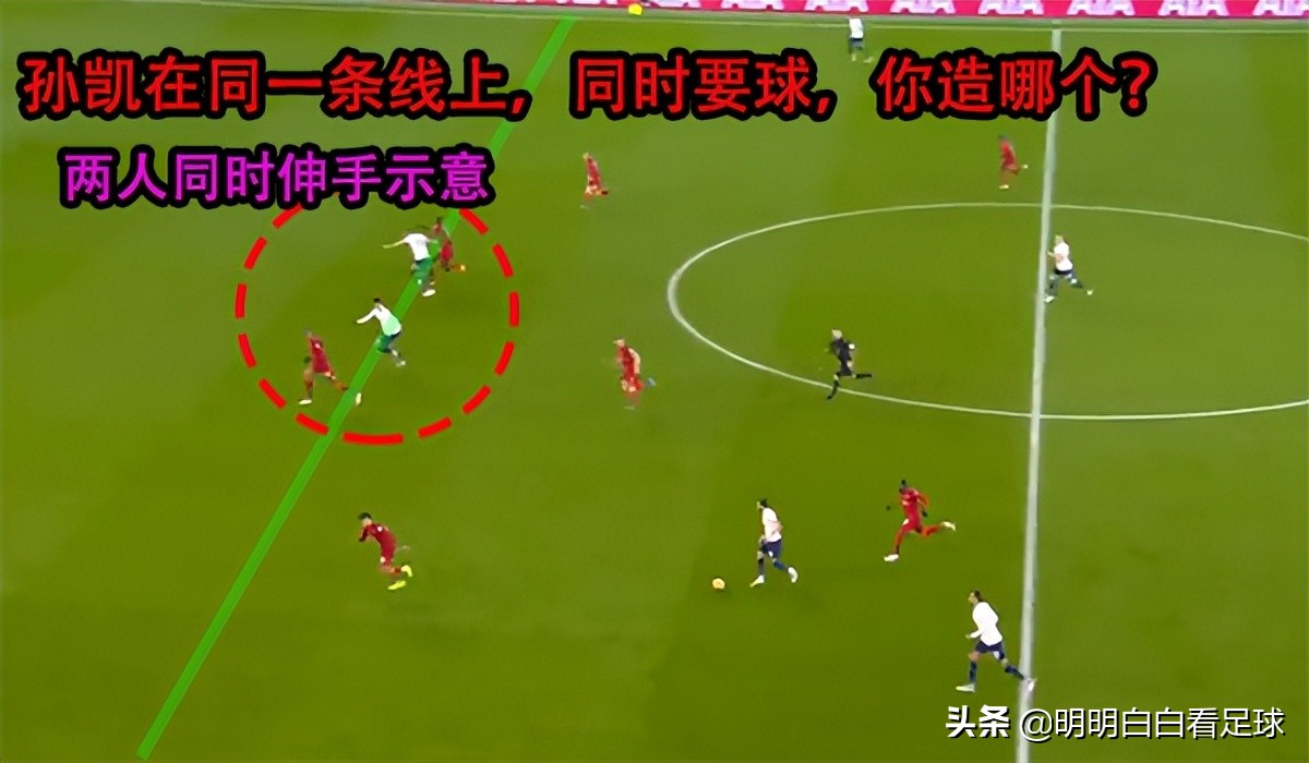 Son và Kane đứng chính xác trên cùng một đường thẳng, đồng thời giơ tay đòi bóng, khiến Liverpool rất khó đoán sẽ chuyền cho ai, hoặc sẽ tạo việt vị cho ai?