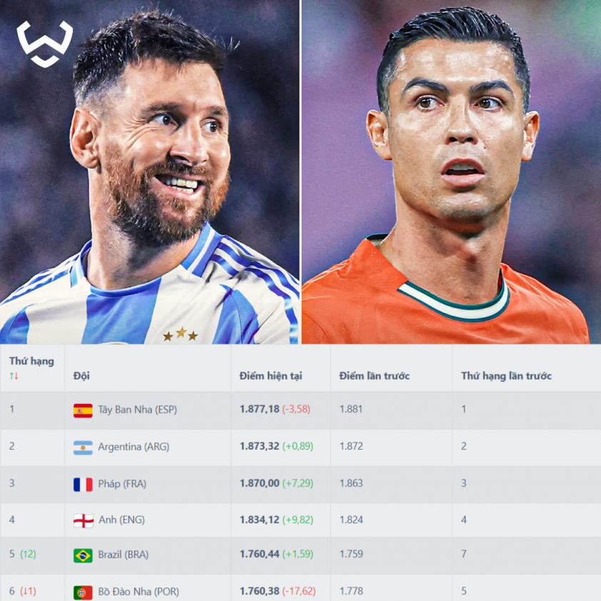 Sau khi kết thúc đợt thi đấu cuối cùng của FIFA năm 2025, cả ĐT Argentina của Lionel Messi và ĐT Bồ Đào Nha của Cristiano Ronaldo đều được xác nhận là hạt giống hàng đầu cho các bảng đấu tại World Cup 2026, dựa trên bảng xếp hạng FIFA vừa được cập nhật.