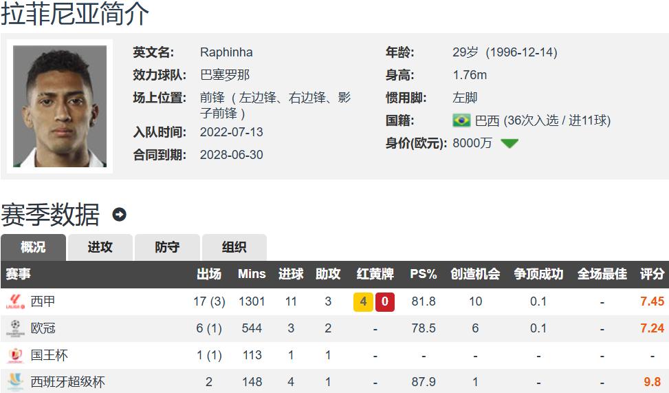 Raphinha năm nay 29 tuổi, cao 1,76m, là cầu thủ chân trái, có thể chơi ở nhiều vị trí tiền đạo, giá trị thị trường theo Transfermarkt là 80 triệu euro, hợp đồng với Barcelona đến năm 2028. Raphinha là công cụ ghi bàn hiệu quả nhất của Barcelona, tính đến nay trong mùa giải này đã ra sân 31 lần ở các giải đấu, ghi 19 bàn và có 8 kiến tạo – thành tích này đạt được ngay cả khi anh gặp chấn thương trong mùa. Giờ Barcelona đang ở thời khắc quan trọng nhất trong cuộc đua vô địch La Liga và Champions League, Raphinha lại không thể ra sân, đây là vấn đề lớn cho HLV Flick. Hy vọng duy nhất là Rashford có thể tỏa sáng, đảm nhiệm tốt vai trò tấn công cánh trái của Barcelona, để đội chủ động quyết định mua đứt với giá 30 triệu euro.