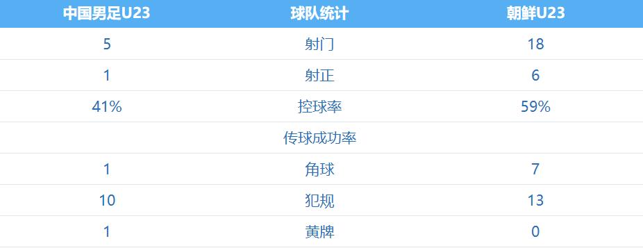 Toàn trận, tỷ lệ kiểm soát bóng của U23 Trung Quốc chỉ 41%, tổng chỉ 5 lần sút, trong đó 1 lần trúng đích, U23 Triều Tiên tổng 18 lần sút, trong đó 6 lần trúng đích. Có thể nói tỷ số 1-1 là U23 Trung Quốc ép hòa đối thủ.