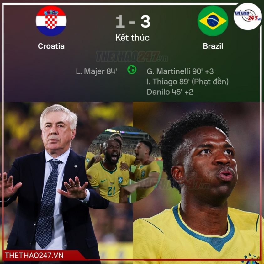 Đội bóng của HLV Carlo Ancelotti sau đó ấn định chiến thắng 3-1 nhờ công của Gabriel Martinelli, người dứt điểm quyết đoán từ đường chuyền của Endrick. Đây mới là chiến thắng thứ hai của Brazil trong 5 trận gần nhất (hòa 1, thua 2), nhưng là bước chạy đà quan trọng trước thềm giải đấu lớn mùa hè.