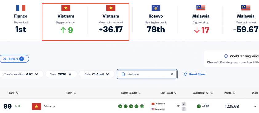 Trang chủ FIFA vừa công bố những thống kê nổi bật trong bản cập nhật ngày 1/4/2026. Đáng chú ý, đội tuyển Việt Nam được xướng tên ở hai hạng mục ấn tượng nhất: đội tuyển thăng hạng nhiều nhất thế giới (tăng 9 bậc) và đội tuyển tích lũy điểm số cao nhất (+36,17 điểm).