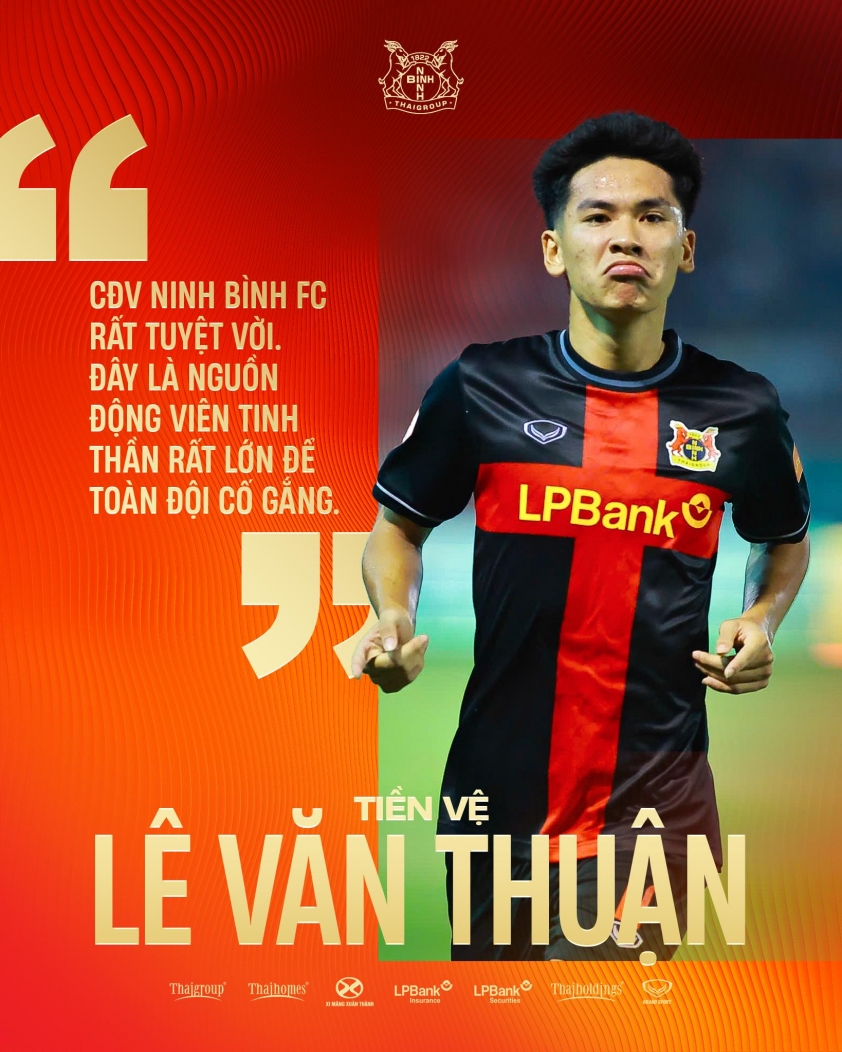 Chia sẻ sau trận, Văn Thuận không giấu được cảm xúc: "Thật sự em chờ đợi bàn thắng này rất lâu rồi. Từ khi em gia nhập CLB Ninh Bình đây mới là trận thắng đầu tiên của em. Trước đó, toàn đội khá là áp lực nhưng anh em trong đội và lãnh đạo CLB, Ban huấn luyện đều cùng nhau đoàn kết, chiến đấu để có được kết quả ngày hôm nay. Em sẽ cùng toàn đội tiếp tục nỗ lực trên hành trình vượt khó của mình. Không giành được kết quả tốt thời gian qua toàn đội rất là áp lực nhưng lãnh đạo CLB rất tâm lý, động viên anh em cầu thủ để cùng nhau chiến đấu, đạt kết quả tốt ngày hôm nay. CĐV Ninh Bình rất tuyệt vời. Trong tất cả các trận đấu của đội, mọi người đều đến sân rất đông và đoàn kết, đó là động lực tinh thần rất lớn cho toàn đội chiến đầu và giành kết quả tốt".