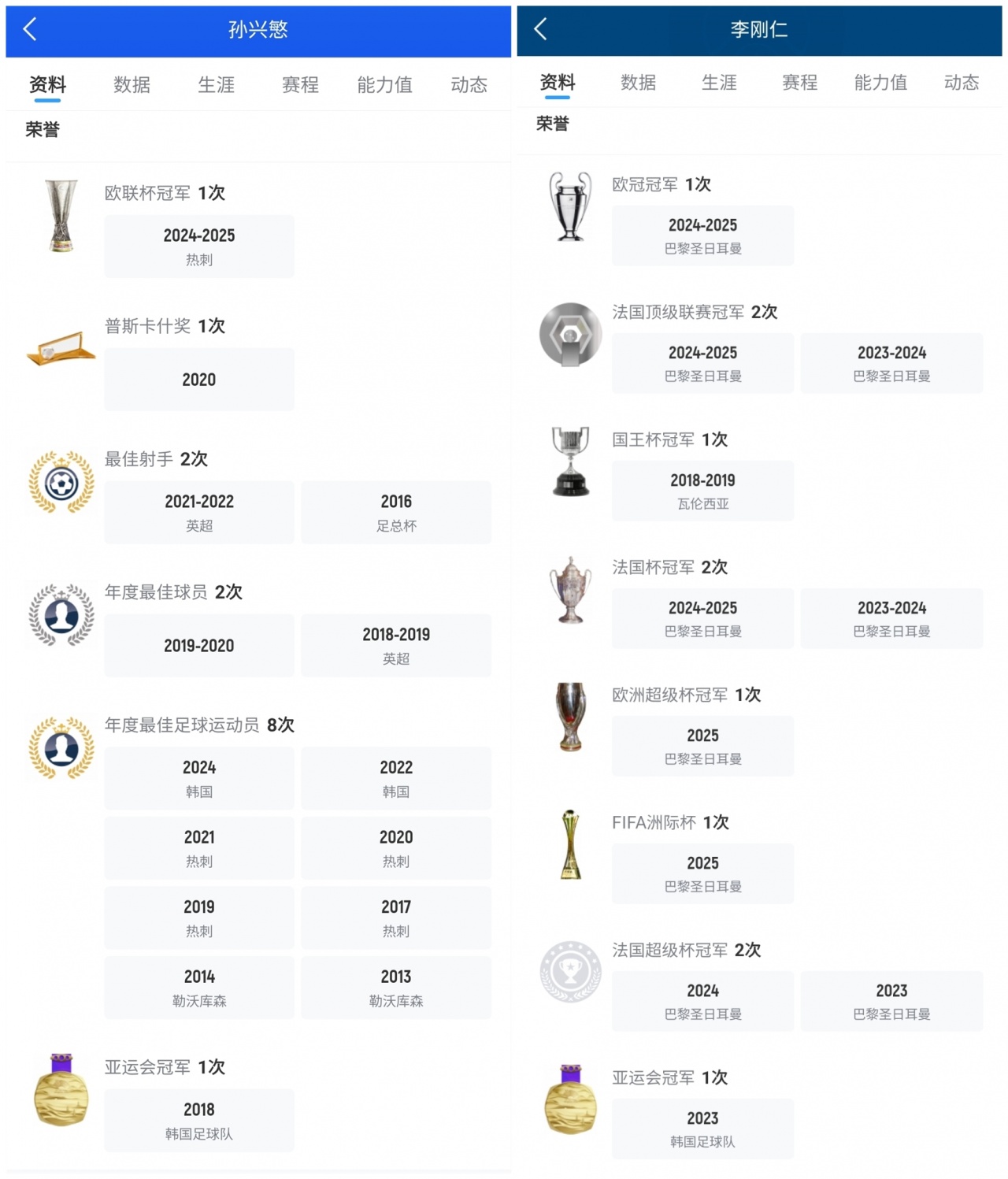 Còn Lee Kang-in 24 tuổi đã giành được11 danh hiệu, bao gồm 1 chức vô địch Champions League, 2 chức vô địch Ligue 1, 2 cúp quốc gia Pháp, 1 cúp Nhà vua Tây Ban Nha, 1 cúp Liên lục địa, 1 siêu cúp châu Âu, 2 siêu cúp Pháp và 1 huy chương vàng Asiad.