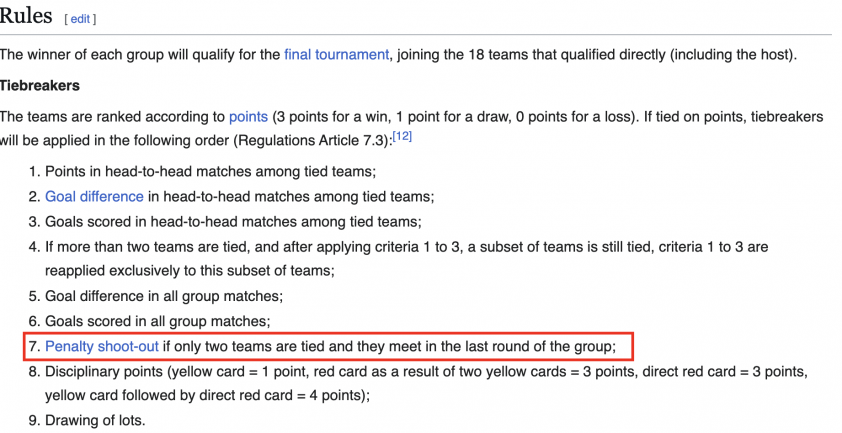 Thông thường khi cân bằng ở các chỉ số thì điểm fair-play sẽ được tính đến. Tuy nhiên theo quy định của AFC dành cho vòng loại Asian Cup 2027, nếu 2 đội bằng nhau ở mọi hiệu số mà gặp nhau ở lượt trận cuối, sẽ tiến hành đá penalty để phân định xem đội nào sẽ giành vé đi tiếp.